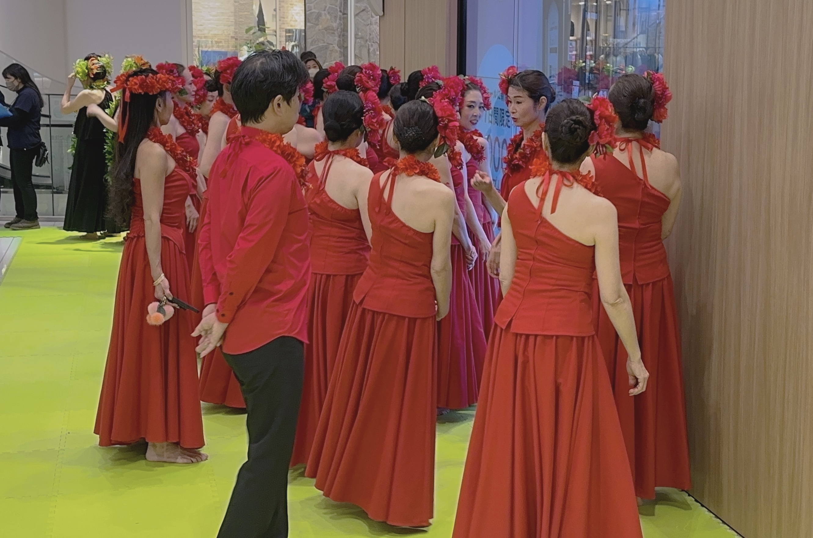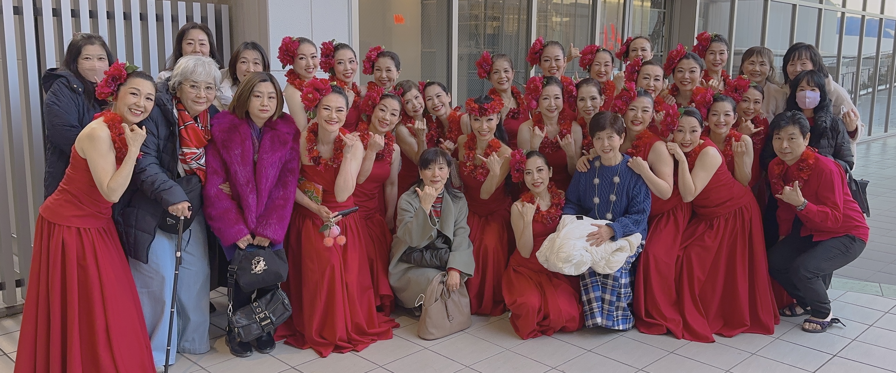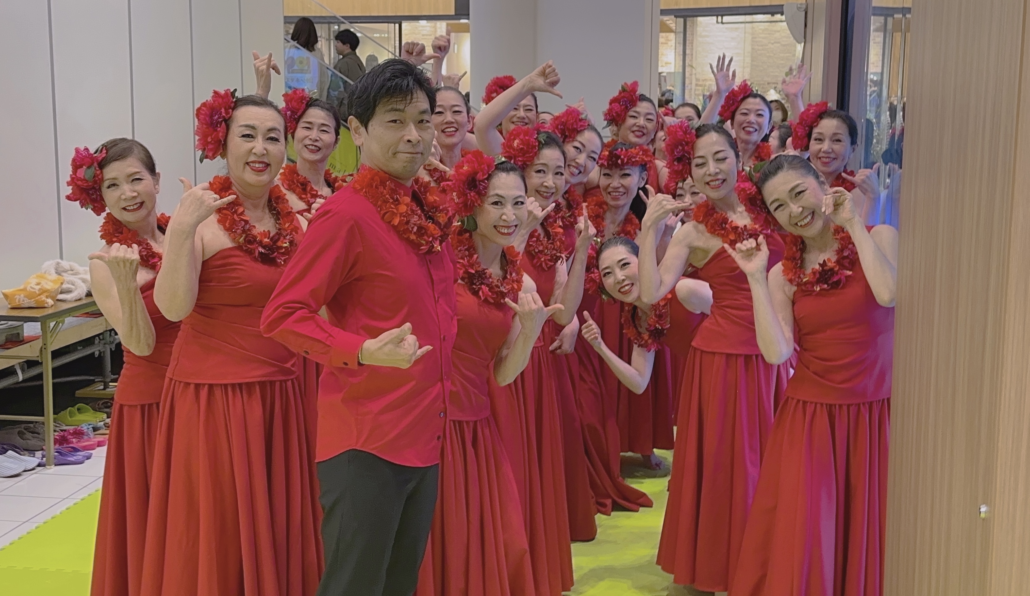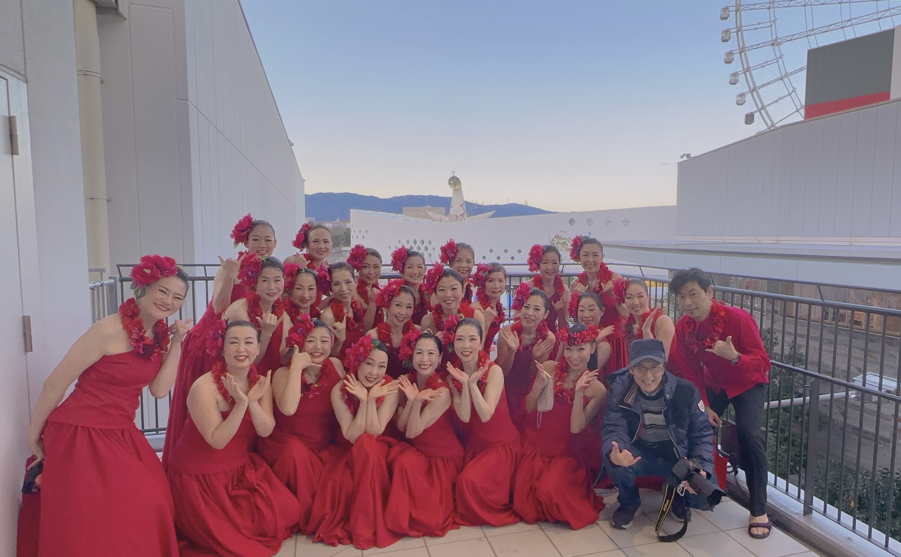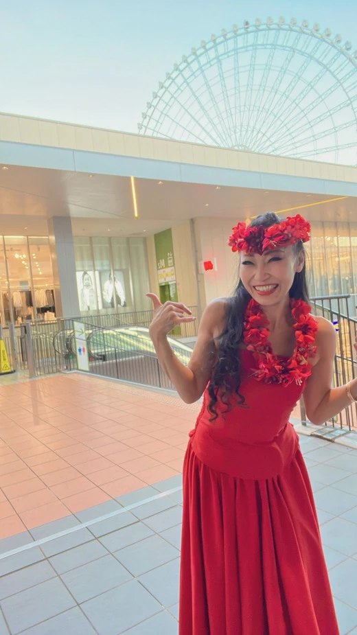 この赤いドレスと髪飾りやレイ